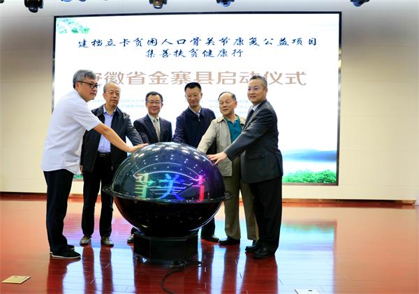 随后,各级领导上台共同启动了水晶球,标志着该项目在金寨落地生根、正式开展。在启动仪式前,曲铁兵主任向金寨县中医医院院长孙大国授予了建档立卡贫困人口骨关节康复公益项目“积善扶贫健康行”爱心医院的牌匾。至此,金寨县中医医院成为全省第一家该项目实施医院。